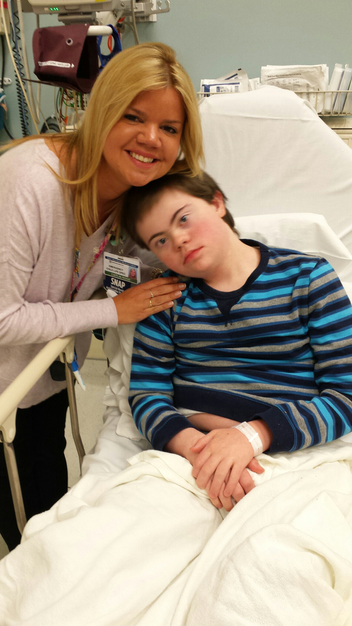 Brian was so relaxed, that I was able to trim his finger and toe nails, AND a little bit of his hair, after the blood draw and ultrasound. What a difference and a dream to have an anxiety-free experience! The nurses drew the blood with Karen Carpenter singing on the i-pod I brought. Someone suggested a scented candle, lol, the hospital ER just doesn’t get any better than this! But it actually did, with the arrival of Caitlin, a Child Life Specialist, who is part of the Special Needs Ambassador Program (SNAP) in the Pediatric Emergency Room at St. Barnabas and pictured above with Brian. What an angel!